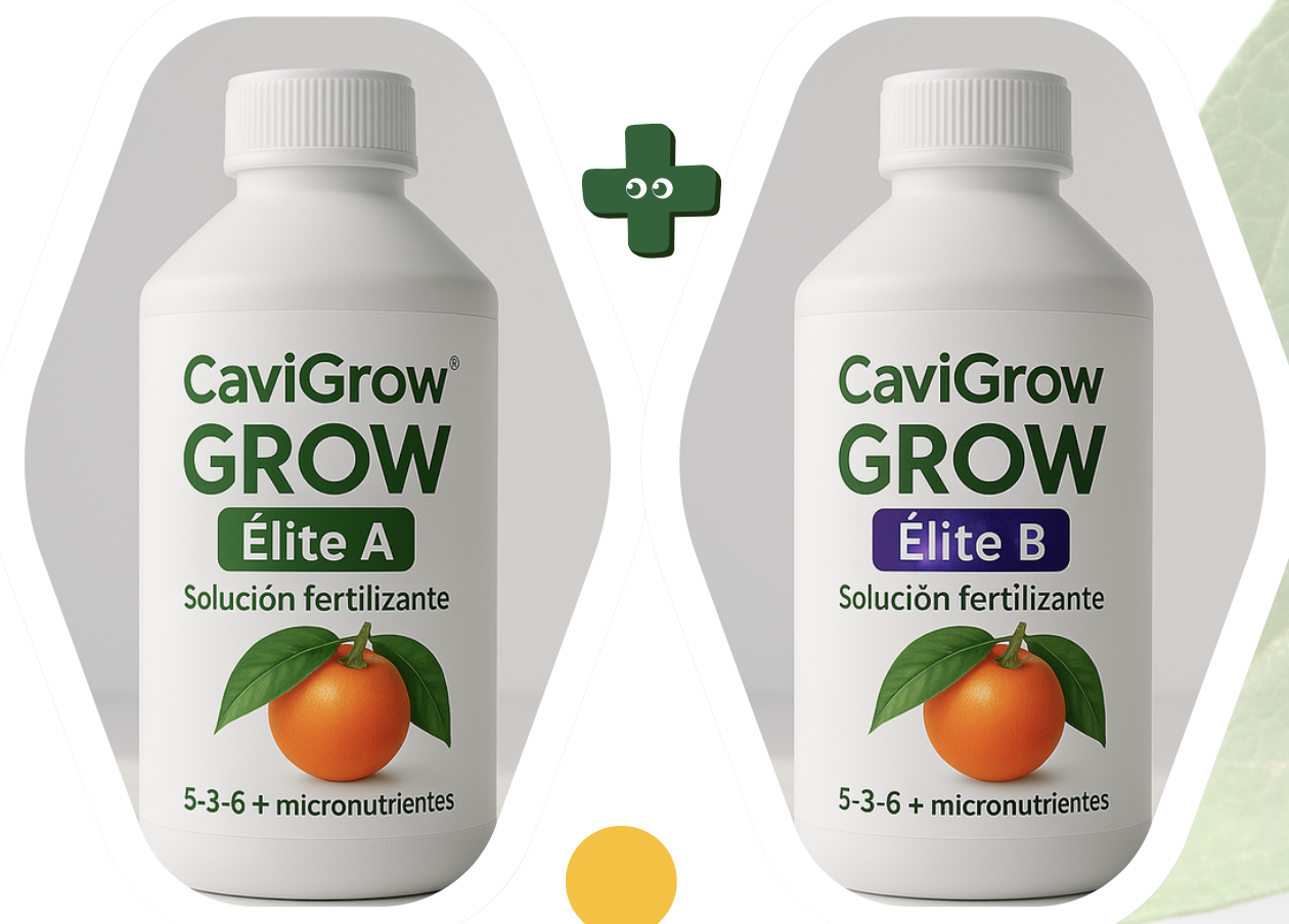 Optimice el desarrollo de sus cítricos con CaviGrow GROW Élite (A+B). Bioestimulantes de vanguardia para maximizar el crecimiento foliar y lograr una estructura robusta en sus limoneros, naranjos o mandarinas.